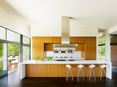 Designed by Julie and Leslie Dowling of Dowling Studios, the modern home with double sided indoor/outdoor fireplace is positioned atop a knoll on an 8 acre site.